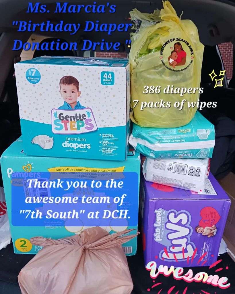 Ms. Marcia collected 386 diapers and 7 packs of wipes in her Birthday Diaper Donation Drive.