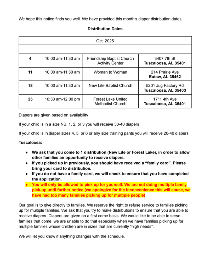If you don’t have an application on file: Please be prepared to complete the application before you receive diapers.
